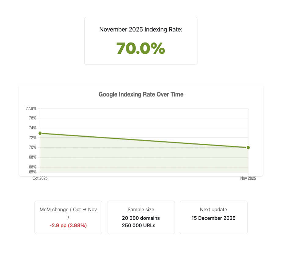 Kasım 2025 için gösterge %70,0'lık bir indekslenme oranı gösteriyor (Ekim ayında %72,9). Bu, yüzde olarak 2,9 puanlık, örneklemdeki indekslenen sayfa sayısı olarak ise yaklaşık %3,98'lik bir düşüşe karşılık geliyor. Somut olarak bu, örneklemdeki 'ortalama' bir sitenin sayfalarının ortalama olarak 10'da 3'ünün, çevrimiçi ve site haritalarında beyan edilmiş olsalar bile Google'da görünür olmadığı anlamına geliyor.